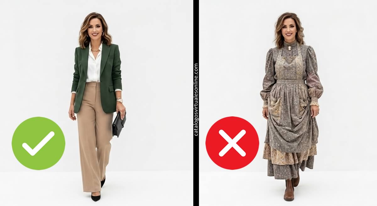 Vamos a tocar un punto sensible, pero necesario. Veo este error en la calle, en los catálogos y en las reuniones de café: mujeres espectaculares que deciden «desaparecer» bajo capas y capas de tela ancha.