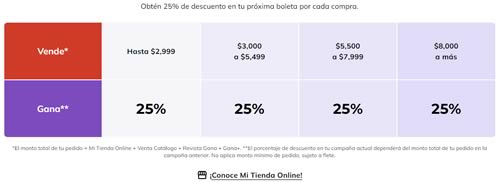 Las ganancias de ventas por catálogo varían de acuerdo a tu país. Por ejemplo, en México van desde el 30% hasta el %50 de acuerdo al monto de tus ventas.
